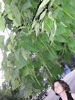 After the lhasang ended, I returned a few phone calls, picked up my mail and found more cards and packages waiting for me, talked to my sisters (yay!) went to Dol & Adam's place to feed their dog, went to the Indian Grocery that I visit once or twice a week to return a movie and pick up a new one. The store owner, who is one of the reasons I shop there so regularly, asked me why I was so happy and I told him it was my birthday. He not only refused to let me pay for my movie rental, but he insisted on giving me something sweet to have to symbolize having a sweet year. He tried to give me a giant tub of mango ice cream, but since I was going straight from there to dinner it would be mango soup. He gave me instead a box of sweets that I'm looking forward to cracking into this weekend! I then went to my self-declared women-only dinner with Dol and Miss J and Adam came for about 30 min, and we had lots and lots of yummy food and crazy amounts of cheese. I received an amazing gift of pottery named Mr. Wilson that Miss J made. I just can't stop touching it...it is so pretty! After dinner Miss J and I walked to downtown and on the way we took photos of crazy bean trees (Catalpa trees) filled with bean pods that were more than a foot long.